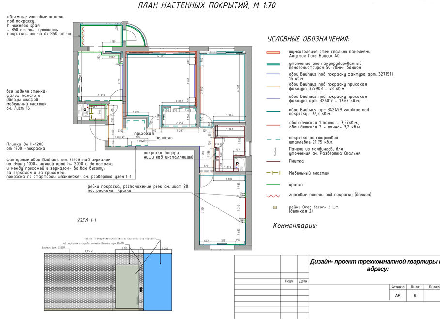 Чертежи встроенной мебели, с указанием цвета материала, декоративных деталей.